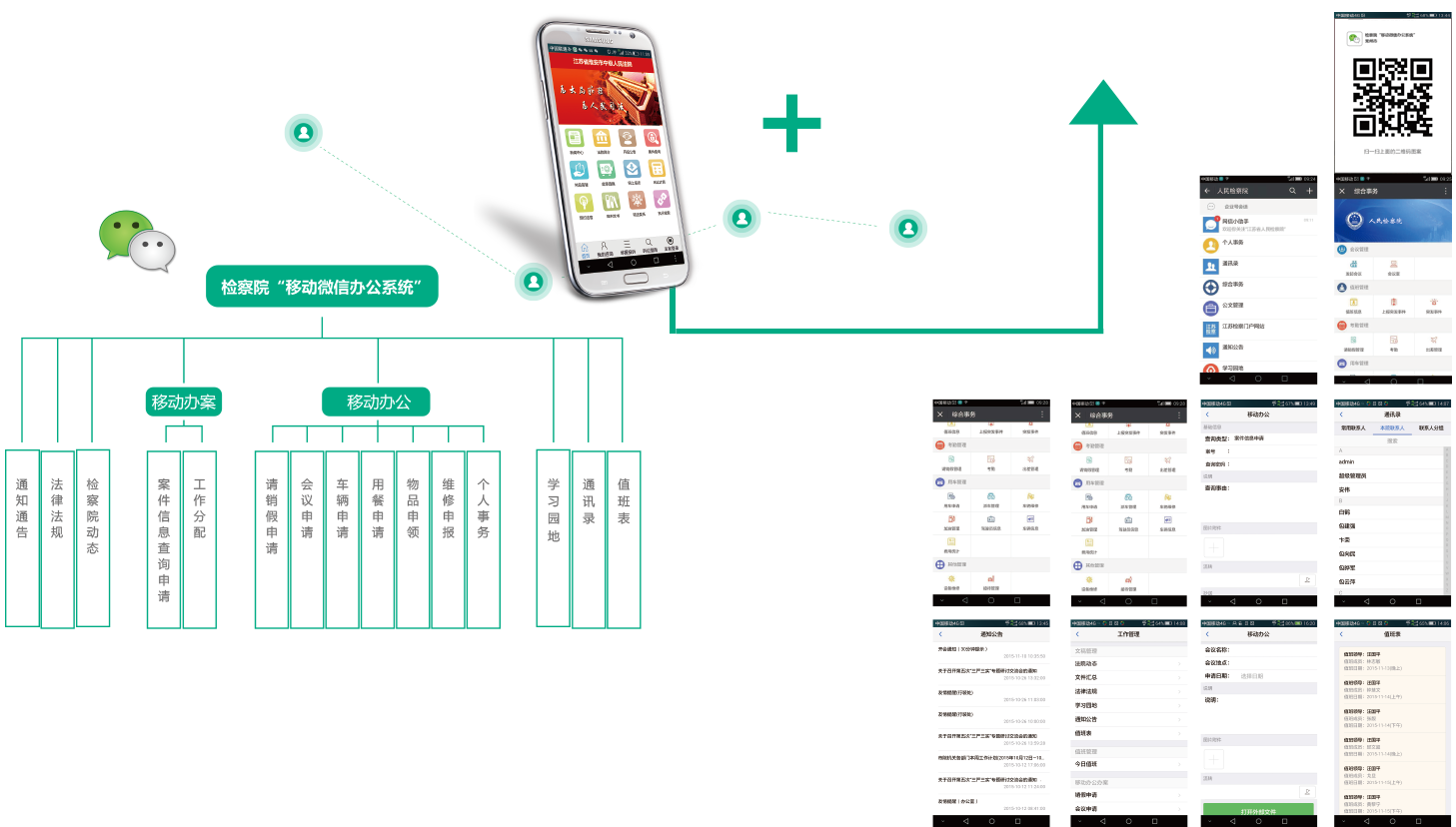 本項目“檢務通”是檢察院內部移動辦公系統,是利用微信平臺向干警或其他經設定人員適時發送的:內部工作、相關動態、會議通知、重大活動、事項,領導簽批提醒、工作分配、協同工作等模塊組成,是集辦公、管理于一體,實現了全員、全方位、全過程的信息網絡化,有機統一的整體。